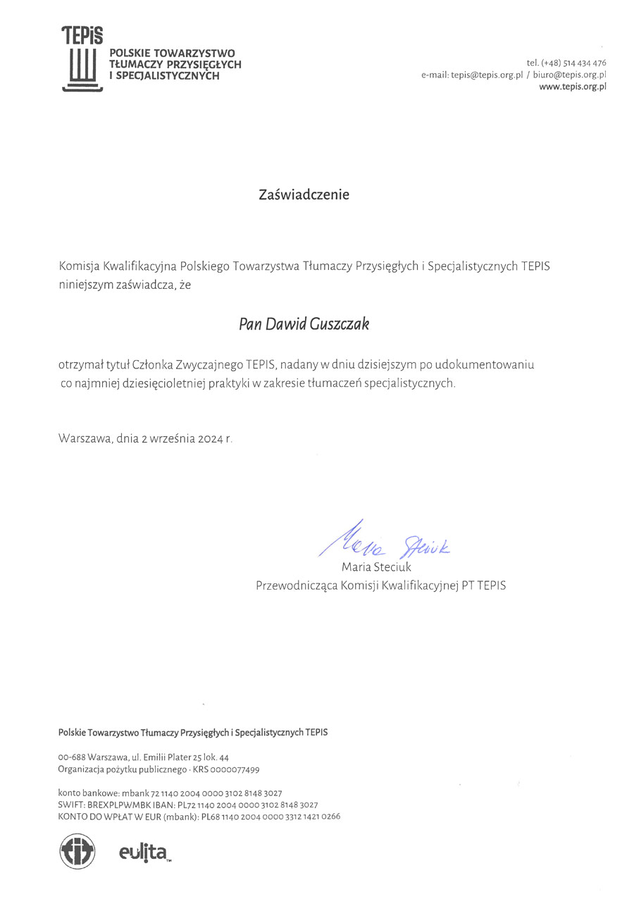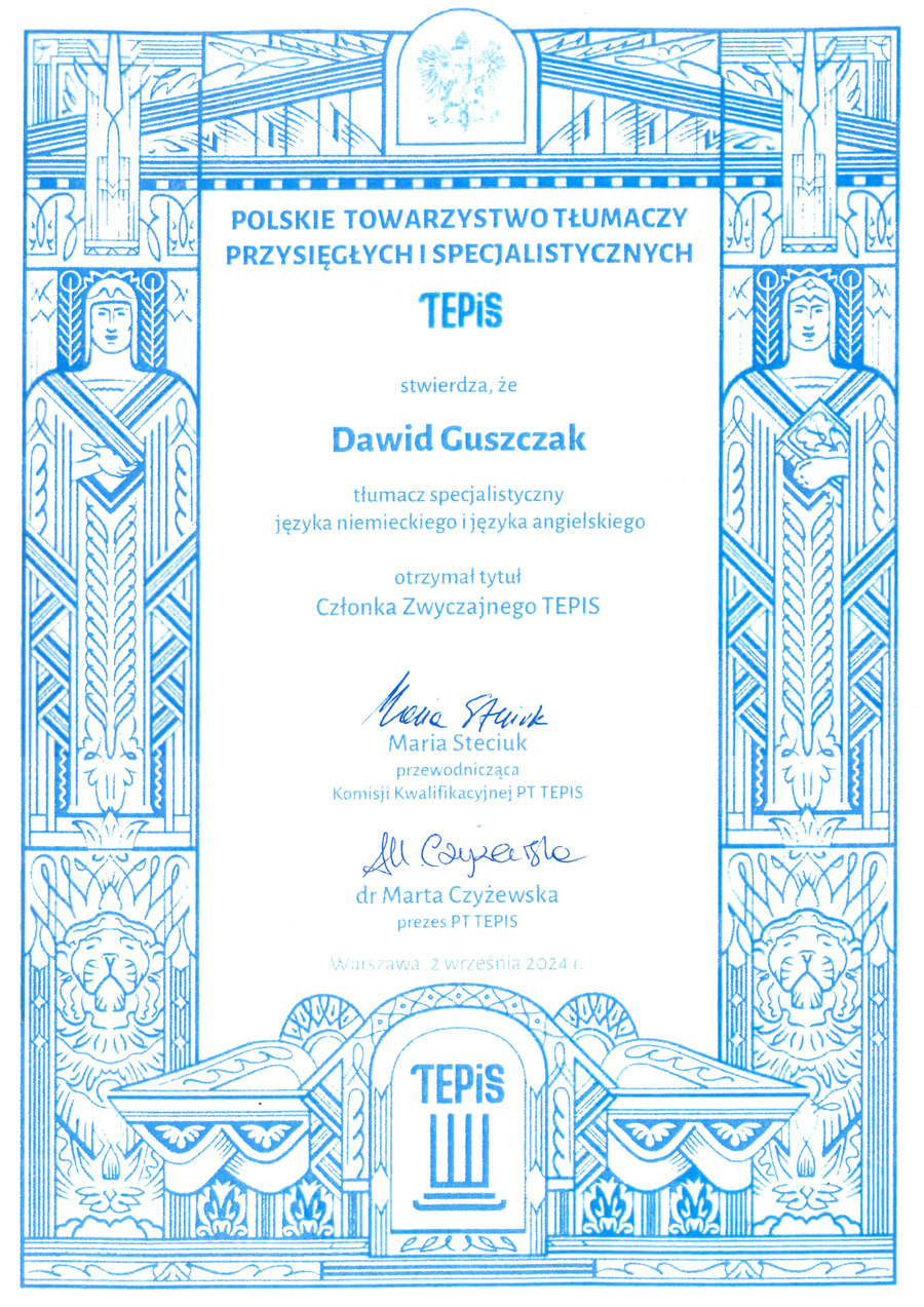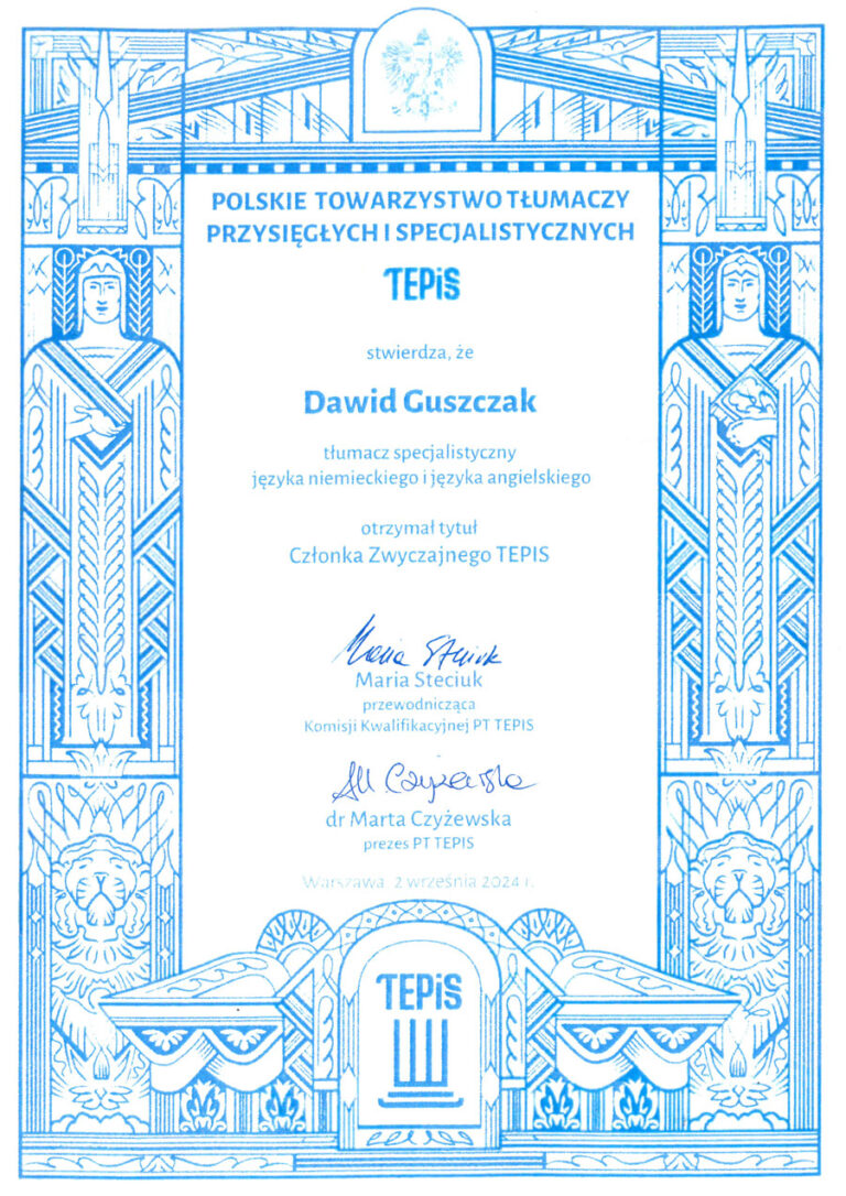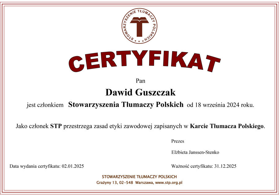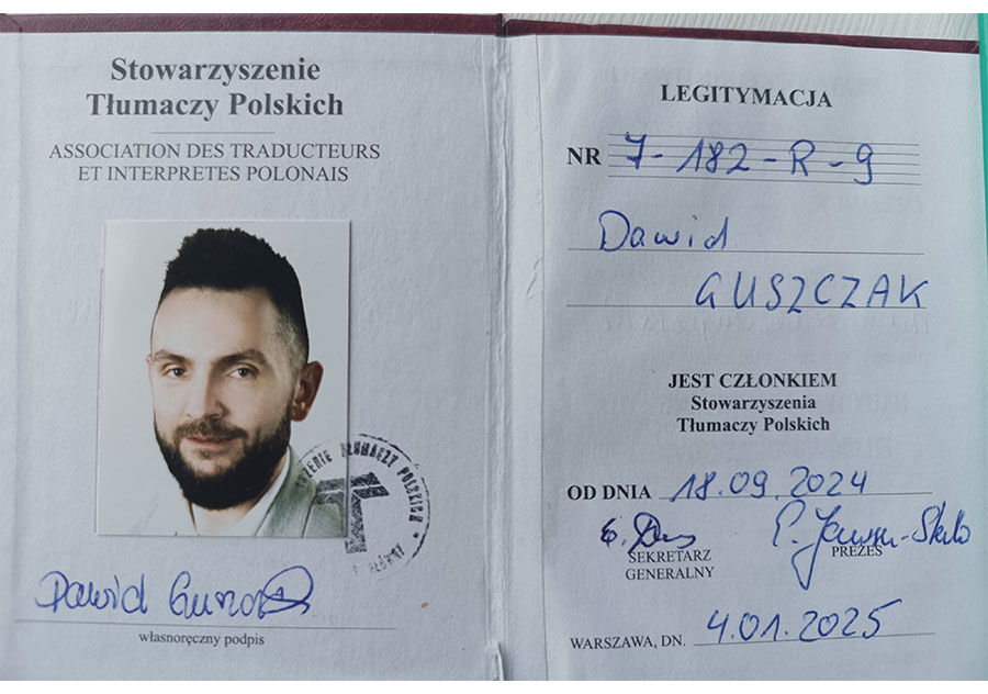 Ich bin Übersetzer der englischen, polnischen und deutschen Sprache. Ich bin ordentliches Mitglied der Polnischen Gesellschaft vereidigter Übersetzer und Fachübersetzer, Mitglied des Polnischen Übersetzer- und Dolmetscherverband sowie Mitglied des Baltischen Übersetzerverbands.